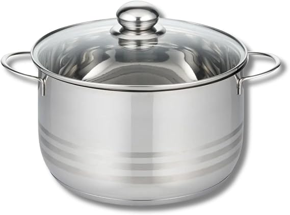 Cooking pot with glass lid Made of stainless steel, body thickness is about 0.5mm, bottom thickness is about 2.5mm. Capsule sandwich bottom with cut straight shape Mirror finish inside with volume markings Mirror finish exterior with three satin stripes. The flat wire handle is made of stainless steel and comes with a shock-resistant stainless steel rim with a finger guard and glass lid on the knob. Dishwasher safe, suitable for all cookware and suitable for all types of heat sources, including induction cookers