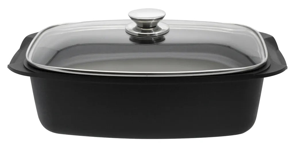 Caring for this kitchen helper is just as easy. After use, you can simply put the roasting pan in the dishwasher, saving you valuable time. The elegant black design with a sturdy glass lid makes it not only practical but also attractive enough to serve directly at the table.