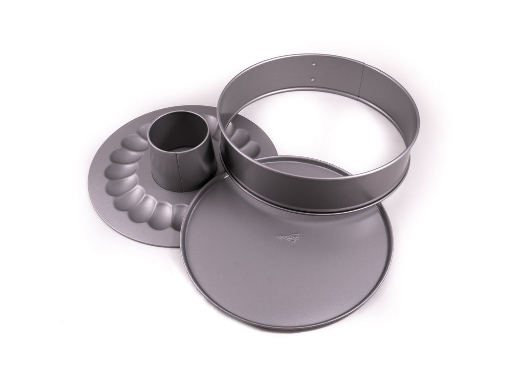 This Springform Tin forms part of the Patisse Silver-Top Range. It is made out of steel with a non-stick coating and can withstand temperatures of up to 230°C. This versatile springform pan comes with two bases, including a flat one and a patterned ring style one. Perfect for making delicate chiffon cakes.